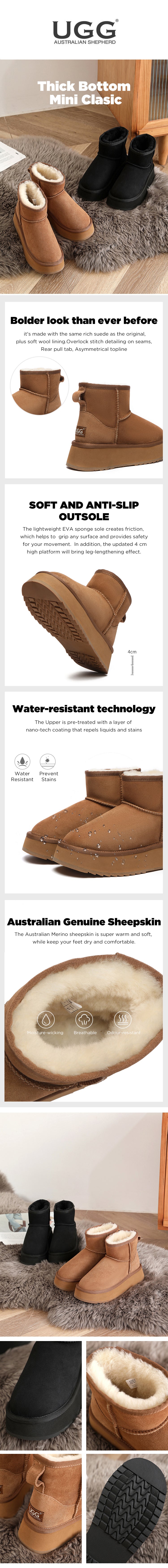 AUSTRALIAN SHEPHERD® Ugg Mini Platform Ugg Boots Thick Bottom Mini Classic #AS3036 Description: The shoe of the moment, get your hands on the must-have style right now. A pair of the Australian Shepherd Mini Platform Ugg Boots will have your outfit ensembles reaching new heights. Choose from two staple colours, black...